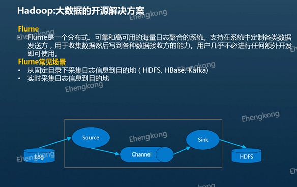 讲完消费者,我们再来介绍可以作为生产者传说数据的Flume,Flume是一个分布式、可靠和高可用的海量日志聚合的系统,支持在系统中定制各各类数据发送方,用于。收集数据然后写到各种数据接收方的能力,用户几乎不必进行任何额外的开发即可使用,只需要配置好Source、Channel和Sink就可以进行数据传输。所谓Flume适用于需要传输数据并且较少开发的场景。接下来我们来介绍Flume的三个角色,Source也就是数据源。我们会将元始数据建模抽象成自己处理的数据对象,然后缓存到Channel的当中,而Channel的主要作用就是临时缓存数据,接下来就是Sink从Channel中出取出数据,并将数据放到最终的目的地当中。
