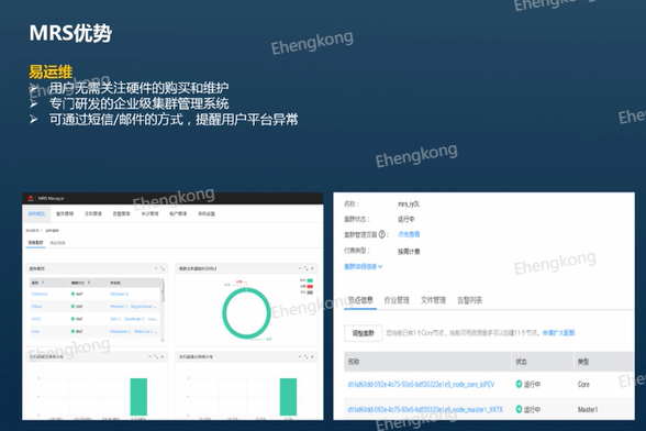 接下来我们来介绍一下MRS的主要优势。首先是易运维,用户可以在分钟级别内完成集群的创建,无需关注硬件的购买和维护,拥有专门研发的企业级集群管理系统,可以让用户更好的监控和管理大数据平台,并且可以通过短信和或者邮件的方式提醒用户平台异常。