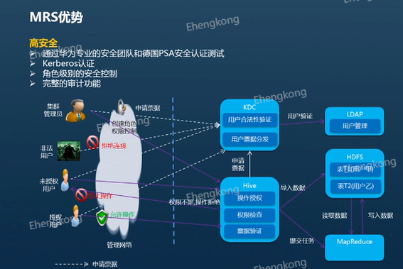 然后是高安全,那么是通过华为专业的安全团队和德国PSA安全认证测试,提供Kerberos认证技术和角色级别的安全控制。非法人员无法对集群进行操作,具有完整的审计功能,所有操作都可追溯。
