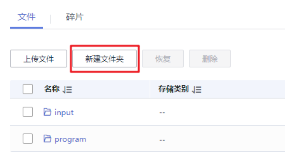 步骤⒉单击obs-demo-analysis-hwt4 文件系统名称。选择左侧导航栏“文件”,在“文件”页签下单击“新建文件夹”,分别新建program、input 文件夹,如图所示。