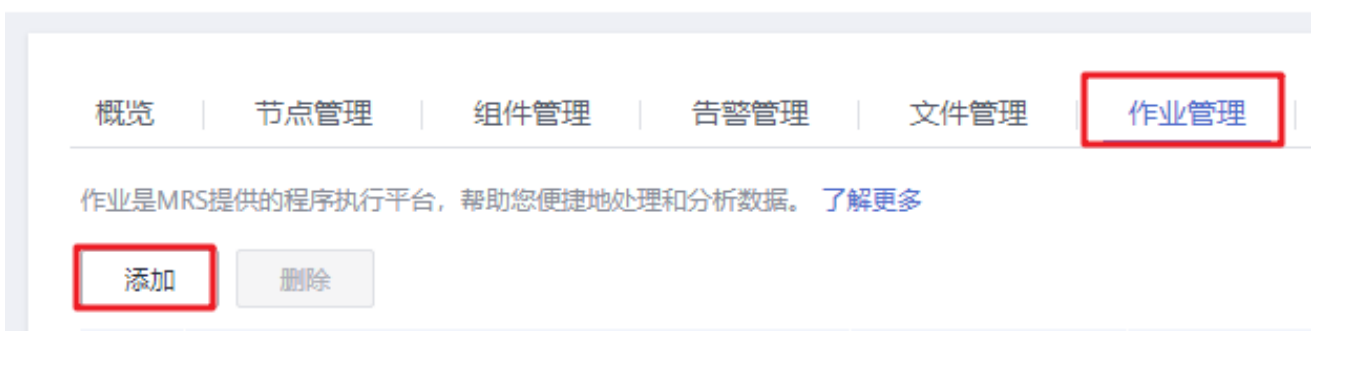 步骤2 在集群信息页面选择“作业管理”页签,单击“添加”,进入添加作业页面。