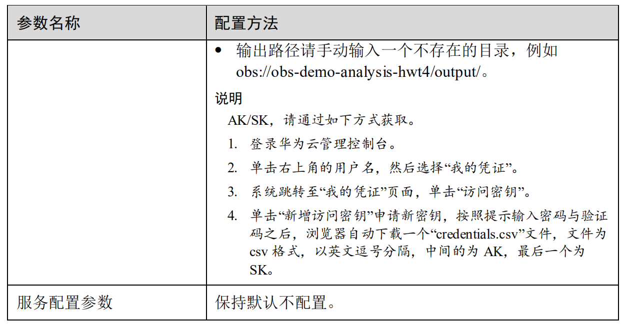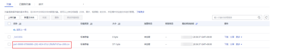 步骤2 等待1~2分钟,登录OBS控制台,进入obs-demo -ana lysis-hwt4文件系统的output目录中,查看执行结果,在生成的csv文件所在行的“操作”列单击“下载”按钮将该文件下载到本地。