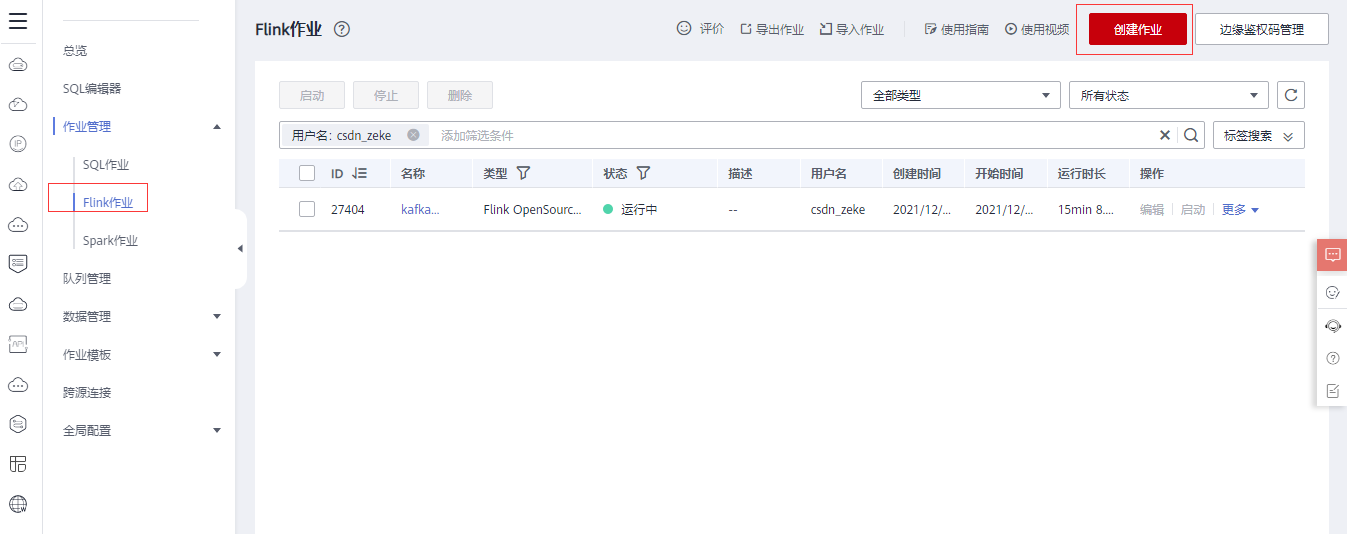 打开数据湖 DLI,作业管理里面创建Flink作业。