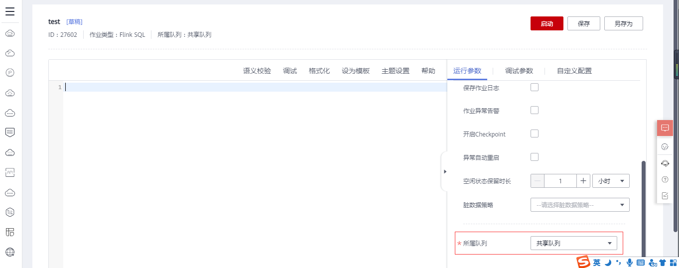 创建作业的时候右侧“所属队列”要选择所创建的DLI通用队列,如果该步骤无法选择创建的CCE队列,则可能是因为没有提前开通CCE队列使用权限。请在官网提工单申请开通CCE队列使用权限后,再重新创建DLI CCE队列,继续后续步骤。