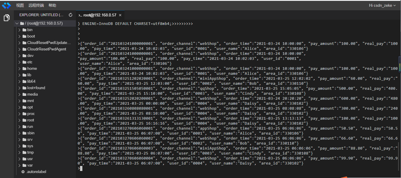 {"order_id":"202103270606060001", "order_channel":"appShop", "order_time":"2021-03-25 06:06:06", "pay_amount":"50.50", "real_pay":"50.50", "pay_time":"2021-03-25 06:07:00", "user_id":"0001", "user_name":"Alice", "area_id":"330106"}