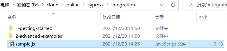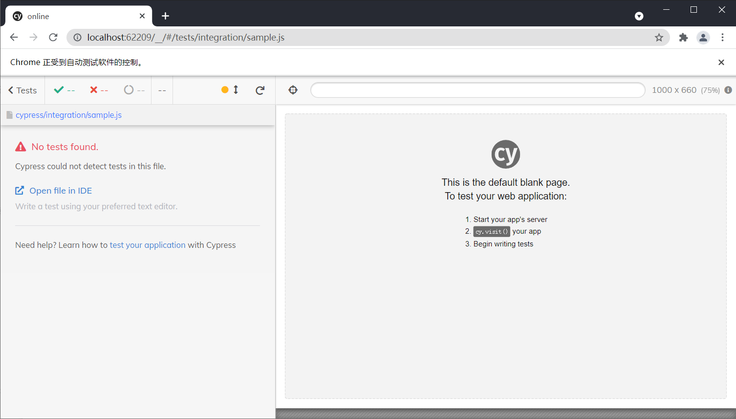 虽然我们还没有写任何有意义的内容在sample.js里,但是我们可以点一下,看看这个cypress框架帮我们做了什么: