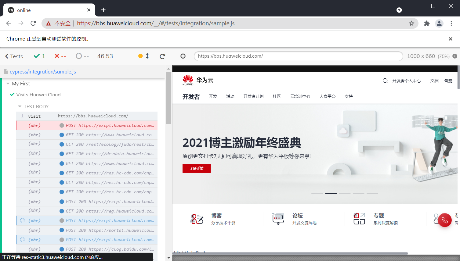 这里我们访问的是华为云的网站。当然这个网站不在我的控制之下,cypress建议不要这样做,但是我觉得没有什么关系,不能开始就被一些并非原则性的规定所约束而放不开手脚,不得前进。