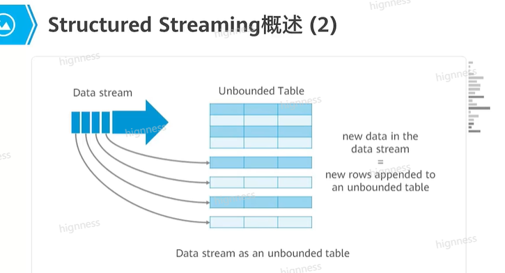如上图所示structured streaming的计算流程。structured streaming将流数据看作成无界表新的记录,当新的数据产生时是structured streaming将新的数据作为无界表新的行。那么structured streaming将新的数据当作了静态的RDD一样的利用spark sql所提供的api进行了分析处理。