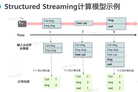 接下来我们看一个structured streaming的计算模型示例。这里我们采用了nc输入数据,在1时刻我们输入的数据就变成了dataframe。对这个dataframe进行分析处理得到一个结果,在2时刻又输入了新的数据,那这个新的数据也插不到这个所谓的无界表中,产生新的数据。在3时刻又增加了两个单词,也是插入到这个无界表中产生新的结果。structure streaming它引入一个特征状态。当随着数据数据增加的时候,它计算出来的结果会合并先前的计算结果,产生最终的计算结果。