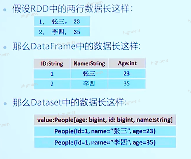 Dataframe是Dataset的特例,DataFrame=Dataset[Row],所以可以通过as方法将Dataframe转换为Dataset。Row是一个通用的类型,所有的表结构信息都用Row来表示。