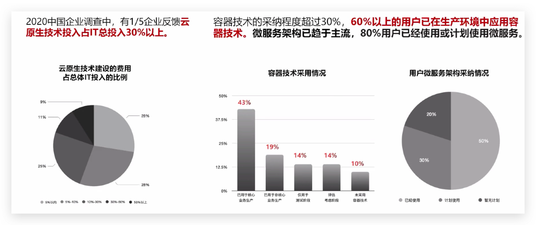 容器技术的采纳程度超过30%,60%以上的用户已在生产环境中应用容器技术。微服务架构已趋于主流,80%用户已经使用或计划使用微服务。
