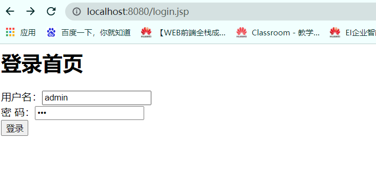 此次实现一个简单的登录功能,登录页面包含用户名和密码两个用户输入框,用户输入用户名和密码,正确则跳转到登录成功界面,并显示用户名;错误则显示登录失败。跳转这里使用重定向