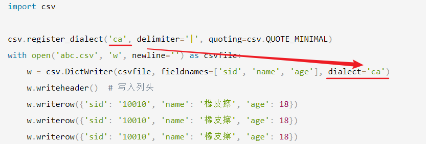 w = csv.DictWriter(csvfile, fieldnames=['sid', 'name', 'age'], dialect='ca')