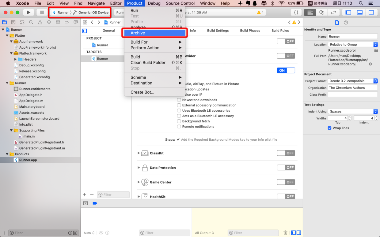 - Product 中选择 Archive 即可,特别注意:此时 Runner 设备必须选择 Generic iOS Device;