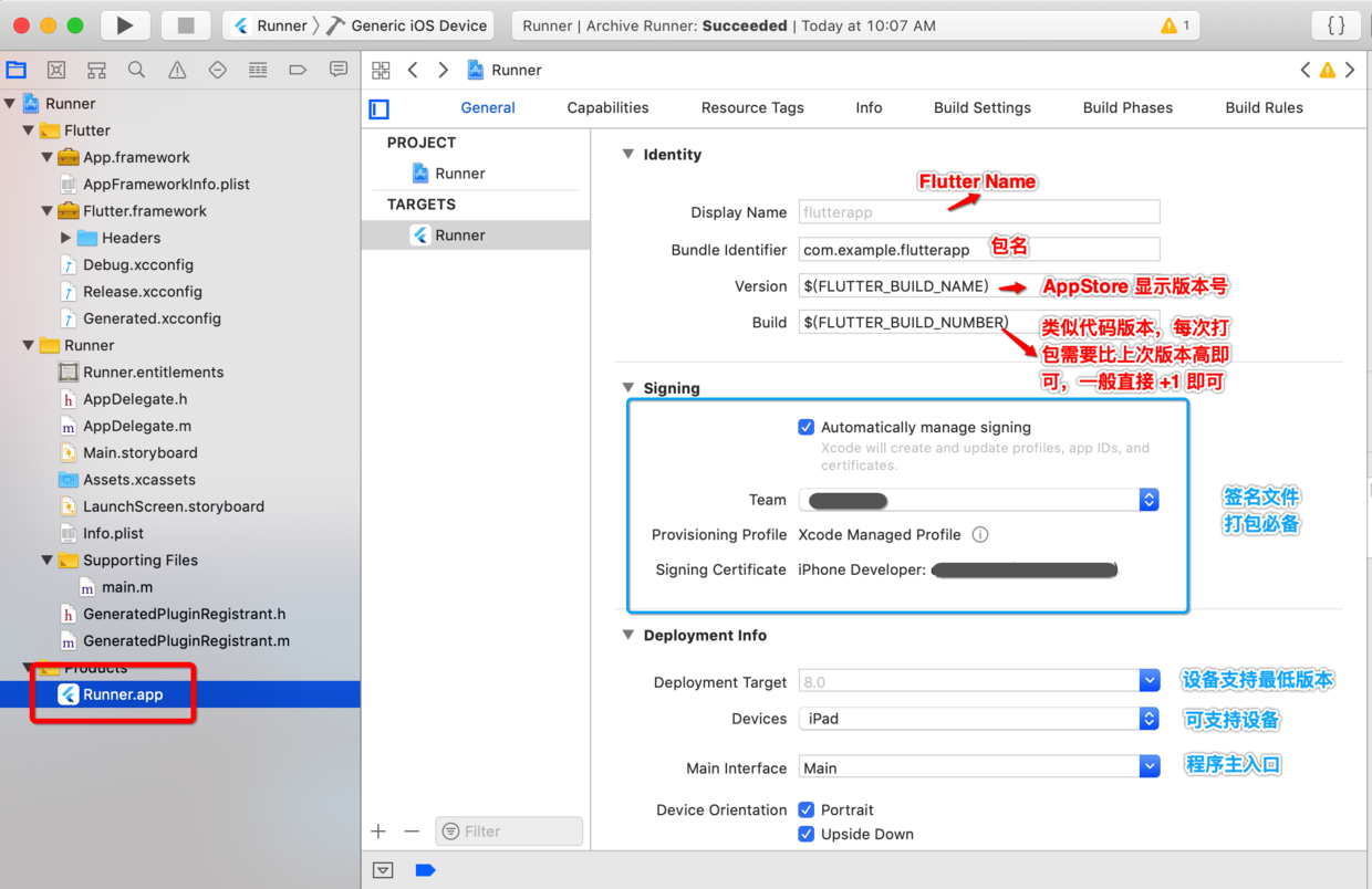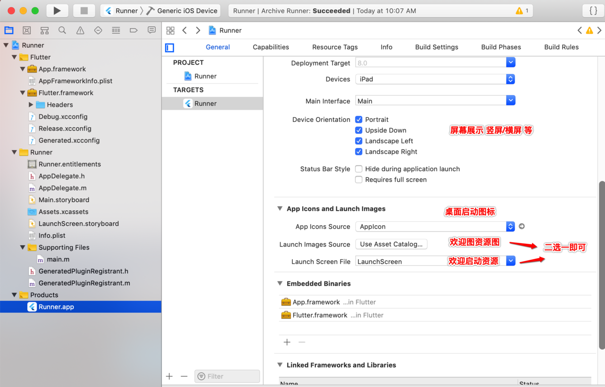2.2 小菜主要学习 Runner.app 中主要内容;在 General 中设置应用名/签名文件/设备兼容/横竖屏/欢迎页等;iOS 欢迎页很方便,可以直接配置欢迎页图标也可以直接配置自己编辑的欢迎页;