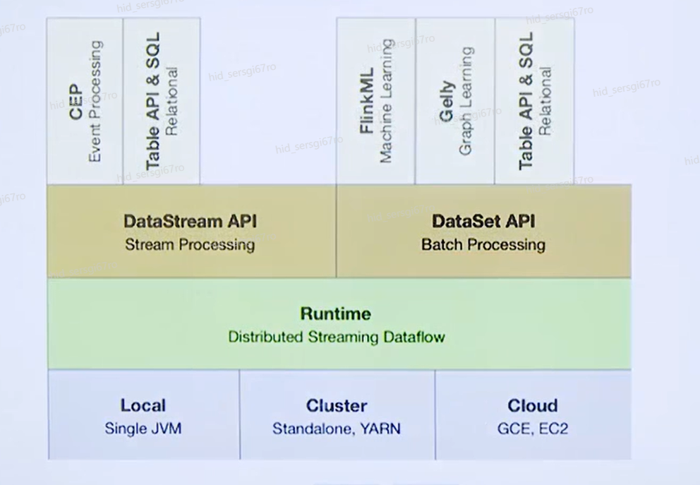 YARN提供了专用的资源管理器。在中间层次是Flink的计算引擎,这个计算引擎它同时能够支持流处理和批处理,可以接收了上层的api提交给它做作业 。Runtime这个引擎上面可以分为了两个模块,一个模块是DataStream api,一个是DataSet api。Flink向dataset和datastream,也就是批数据集以及流数据集是分开处理的,但是都是公用下面的计算引擎。基于两种类型的api,Flink又提供了更多的上层的抽象的api,API越抽象,它的表达能力越弱,但是它对数据的处理能力、抽象性也越强。在针对于上层Table api和SQL,它是主要是针对关系运算的,那针对关系数据的查询,Flink提供了统一的接口,基于流数据api,同时提供了复杂事件处理api。复杂事件指的就是说对不能够用时间去表示事件的开始、次序以及结束这样的事件进行处理的api接口。另外针对于数据及api,它提供了机器学习api以及图计算的api。