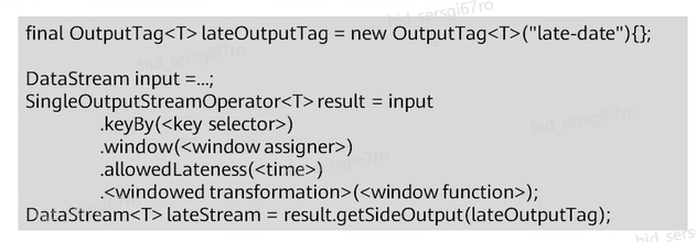 设置allowedLateness之后,迟来的数据同样可以触发窗口,进行输出,利用Flink的sideoutput机制,可以获取到这些延迟的数据,使用方式如下: