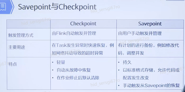 - 从特点上看,Checkpoint轻量,自动从故障中恢复,在作业停止后默认清除;Savepoint持久,以标准格式存储,允许代码或配置发生改变,手动触发从Savepoint的恢复。