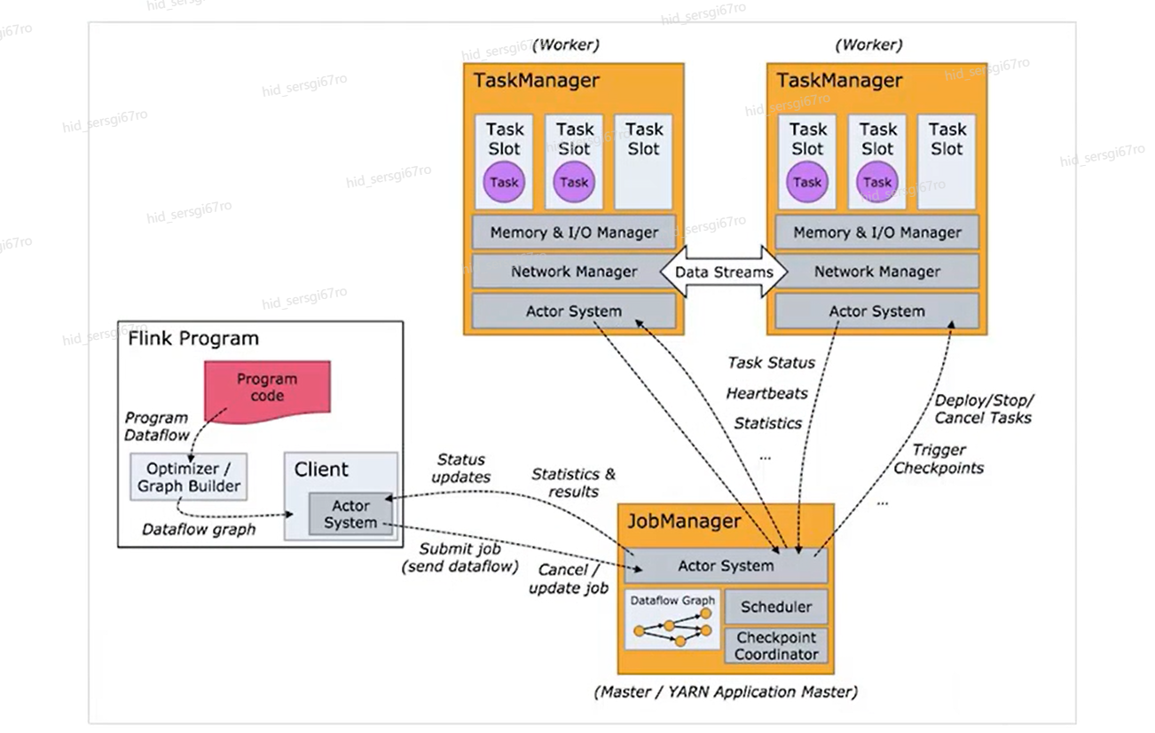 在Flink中它通过了JobClient提交了任务,做过JobClient提交的任务进一步的进行优化、解析以及处理,提交给了JobManager。JobManager会将jobClient提交了逻辑数据流图转换成物理数据流图,然后将这些任务分配给taskmanager。taskmanager接受到任务之后就相应地进行处理,并且汇报了task的状态给JobManager,JobManager最后就把结果反馈给jobClient。