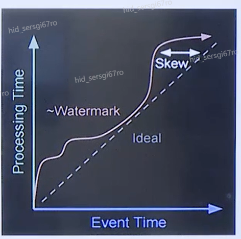 横坐标代表Event time,纵坐标代表processing time。理想情况下,eventtime和processing time构成的坐标应该形成一条倾斜角为45度的线。但实际应用过程中,processing time要落后与eventtime,造成事件到来的先后顺序不一致。