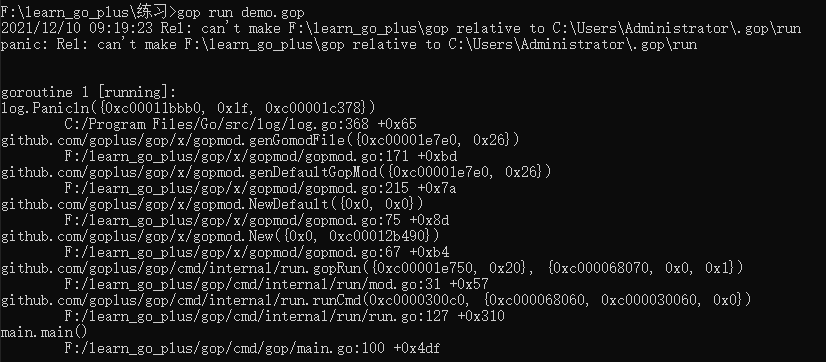 再次通过控制台进入 练习 文件夹,输入 gop run demo.gop 即可输出 hello world 。