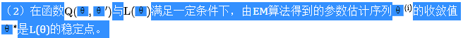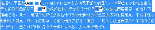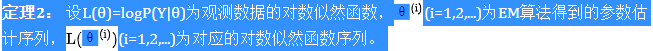 EM算法提供一种近似计算含有隐变量概率模型的极大似然估计的方法。EM算法的最大优点是简单性和普适性。我们很自然地要问:EM算法得到的估计序列是否收敛?如果收敛,是否收敛到全局最大值或局部极大值?下面给出关于EM算法收敛性的两个定理。