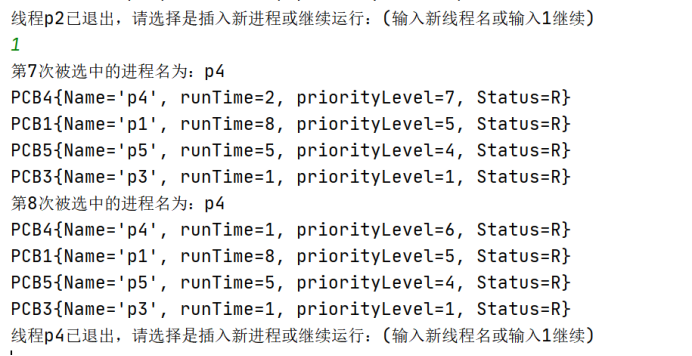(7) 在所设计的程序中应有显示或打印语句,能显示或打印每次被选中进程的进程名以及运行一次后进程队列的变化。