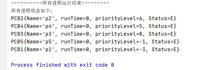 (5) 进程运行一次后,若要求运行时间¹0,则再将它加入队列(按优先数大小插入,且置队首标志);若要求运行时间=0,则把它的状态修改成“结束”(E),且退出队列。
