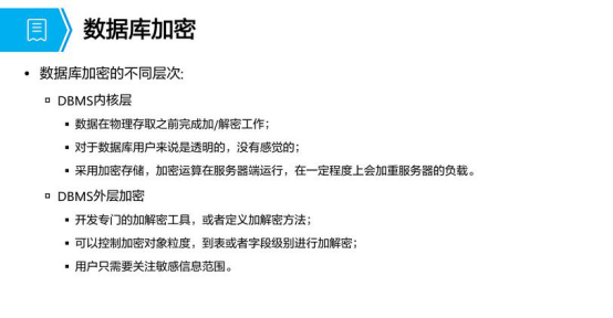 数据库加密的不同层次:DBMS内核层和外层加密。