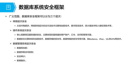 数据库系统安全框架三个层次,网络层次安全(从技术角度讲,网络系统层次安全方法技术主要有加密技术,数字签名技术,防火墙技术和入侵检测技术等)、操作系统层次安全(核心是要保证服务器的安全,主要体现在服务器的用户账户,口令,访问权限等方面)、数据管理系统层次安全(数据库加密、数据存取访问控制、安全审计、数据备份), 安全控制、身份验证、访问控制、开启审计、数据库加密,性能管理方面(资源、性能管理的意义、性能管理的目标)、运维管理方面(数据库安装、卸载、迁移、扩容)等。