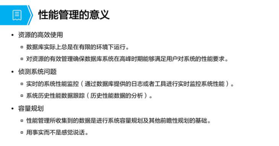 安全管理(数据库系统安全框架、安全控制、身份验证、访问控制、开启审计、数据库加密);性能管理(资源、性能管理的意义、性能管理的目标、建立性能报表);运维管理(数据库安装、卸载、迁移、扩容、维护等)。