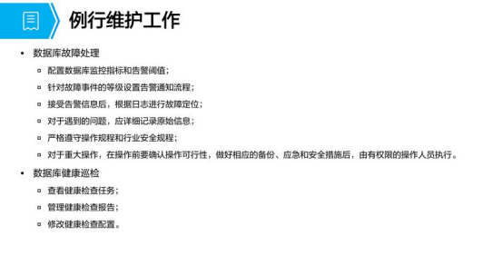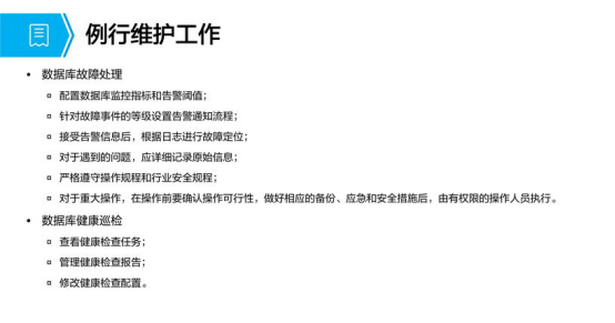 例行维护工作。数据库故障处理。数据库健康巡检。