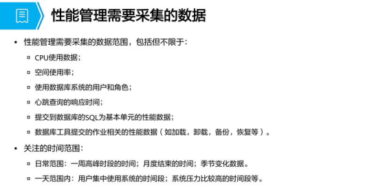 CPU使用数据,空间使用率,使用数据库系统的用户和角色,心跳查询的响应时间,提交到数据库的SQL为基本单元的性能数据,数据库工作提交的作业相关的性能数据。
