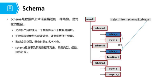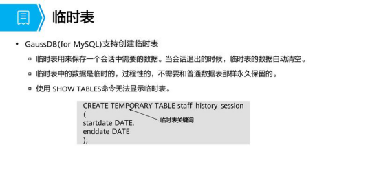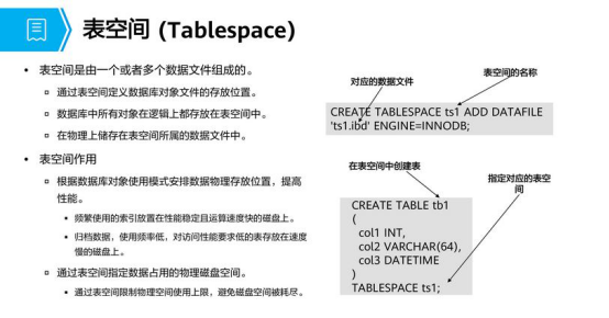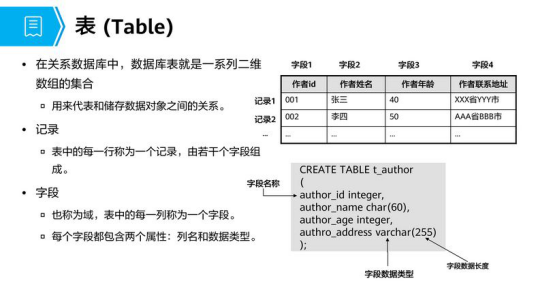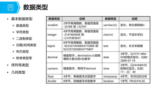 物理层面的通信连接指的是一个通过网络建立的客户端和专有服务器(Dedicated Server)或调度器(Shared Server)的一个网络连接,数据库会话(Session)客户端和数据库之间通信的逻辑概念Schema是数据库形式语言描述的一种结构,是对象的集合,表空间是由一个或者多个数据文件组成的,在关系数据库中,数据库表就是一系列二维数组的集合,表中的每一行称为一个记录,由若干个字段组成,也称为域,表中的每一列称为一个字段,GaussDB(for MySQL)目前只支持行存,GaussDB(DWS)支持行存和列存,行存是默认存储方式,分区表是将大表的数据分成许多小的数据子集,称为分区,GaussDB(DWS)只支持范围分区表,分区剪枝对分区对象的查询可以仅搜索自己关心的分区,提高检索效率,GaussDB(DWS)分布式数据库的数据表是分散在所有数据节点(DataNode, DN)上的,所以创建表的时候需要指定分布列,数据类型分基本数据类型(数值类型、字符类型、二进制类型、日期/时间类型、布尔类型、枚举类型等)、序列号类型、几何类型,尽量使用高效数据类型(尽量使用执行效率比较高的数据类型、尽量使用短字段的数据类型、使用一致的数据类型)等。