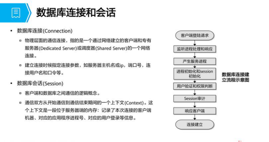 数据库连接是一个通过网络建立的客户端和转悠服务器或调度器的一个网络连接。数据库会话是客户端和数据库之间通信的逻辑概念。
