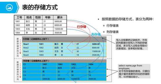 按照数据的储存方式,表分为两种:行存储表和列存储表。
