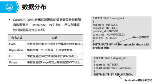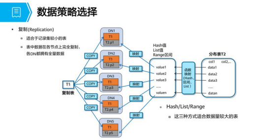 复制,适合于记录集较小的表,表中数据在各节点上完全复制,各DN都拥有全量数据。
