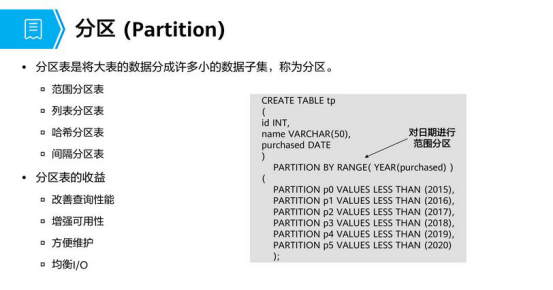分区。分区表是降大表的数据分成许多小的数据子集,成为分区。有范围分区表,列表分区表,哈希分区表,间隔分区表。