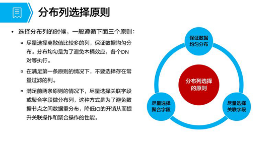一般遵循下面三个原则:尽量选择离散值比较多的列,保证数据均匀分布。在满足第一条原则的情况下,不要选择存在常理过滤的列。满足前两条原则的情况下,尽量选择关联字段或聚合字段做分布列。