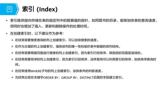 索引提供指向存储在表的指定列中的数据值的指针,如同图书的目录,能够加快表的查询速度,但是同时也增加了插入,更新和删除操作的吹时间。