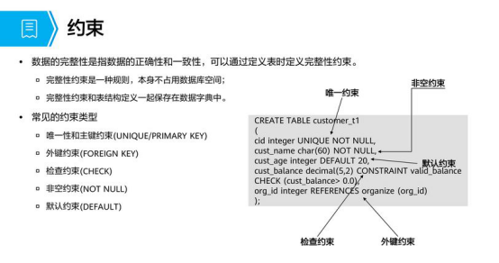 完整性是指数据的正确性和一致性,可以通过定义表时定义完整性约束。常见的约束类型有:唯一性和主键约束,外键约束,检查约束,非空约束,默认约束。