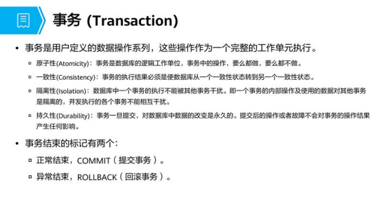 事务是用户定义的数据操作系列,这些操作作为一个完整的工作单元执行,事务ACID四大特性,原子性(Atomicity):事务是数据库的逻辑工作单位,事务中的操作,要么都做,要么都不做。一致性(Consistency):事务的执行结果必须是使数据库从一个一致性状态转到另一个一致性状态。隔离性(Isolation):数据库中一个事务的执行不能被其他事务干扰。即一个事务的内部操作及使用的数据对其他事务是隔离的,并发执行的各个事务不能相互干扰。持久性(Durability):事务一旦提交,对数据库中数据的改变是永久的。提交后的操作或者故障不会对事务的操作结果产生任何影响。