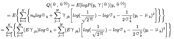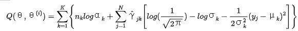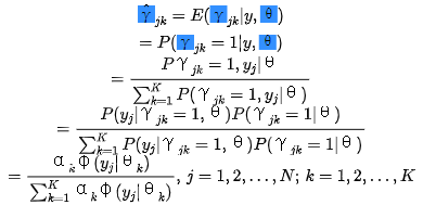 【摘要】 EM算法的一个重要应用是高斯混合模型的参数估计。高斯混合模型应用广泛,在许多情况下,EM算法是学习高斯混合模型的有效方法。1. 高斯混合模型高斯混合模型定义: 高斯混合模型是指具有如下形式的概率分布模型:称为第k个分模型。一般混合模型可以由任意概率分布密度代替高斯分布密度。2. 高斯混合模型参数估计的EM算法明确隐变量,写出完全数据的对数似然函数j=1,2,...,N; k=1,2,...,...