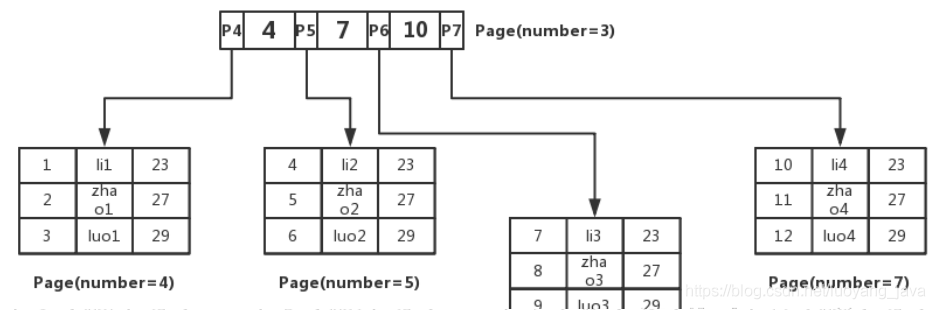 如果数据库只按这样的方式存储,那么如何查找数据就成为一个问题,因为我们不知道要查找的数据存在哪个页中,也不可能把所有的页遍历一遍,那样太慢了。所以人们想了一个办法,用B+树的方式组织这些数据。如图所示: