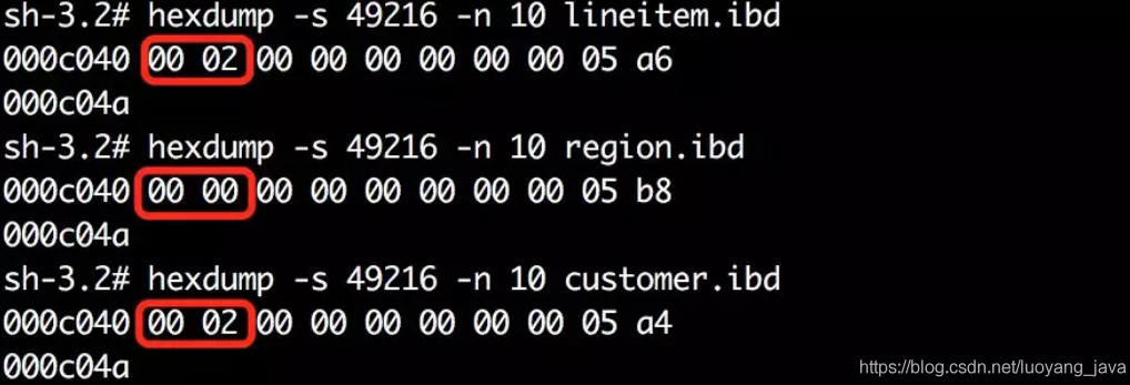 另外根据《InnoDB存储引擎》中描述在根页的64偏移量位置前2个字节,保存了page level的值,因此我们想要的page level的值在整个文件中的偏移量为:16384*3+64=49152+64=49216,前2个字节中。
