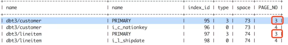 可以看出数据库dbt3下的customer表、lineitem表主键索引根页的page number均为3,而其他的二级索引page number为4。关于二级索引与主键索引的区别请参考MySQL相关书籍,本文不在此介绍。