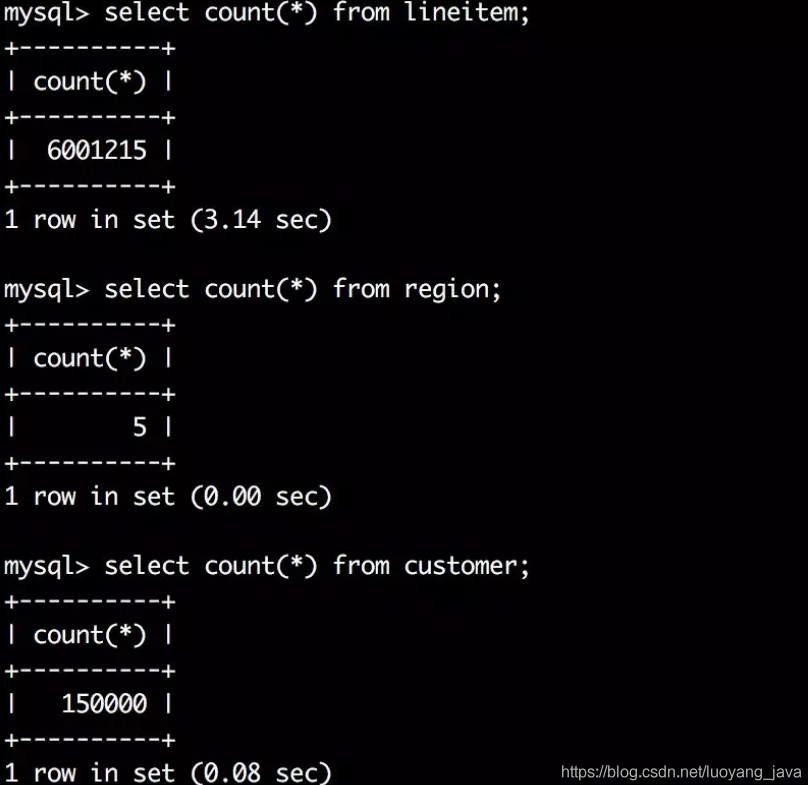 lineitem表的数据行数为600多万,B+树高度为3,customer表数据行数只有15万,B+树高度也为3。可以看出尽管数据量差异较大,这两个表树的高度都是3,换句话说这两个表通过索引查询效率并没有太大差异,因为都只需要做3次IO。那么如果有一张表行数是一千万,那么他的B+树高度依旧是3,查询效率仍然不会相差太大。