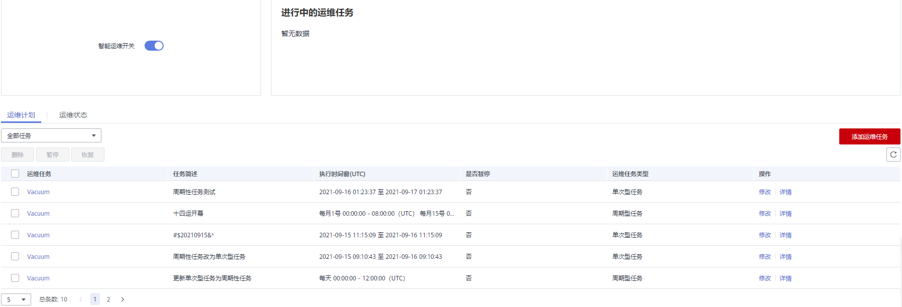 - 智能运维开关(左上方):智能运维开关按钮负责控制智能运维的启停。若智能运维设置为关闭,用户无法注册任何运维任务,已注册的运维任务无法生效,并且正在运行的运维任务将全部停止。