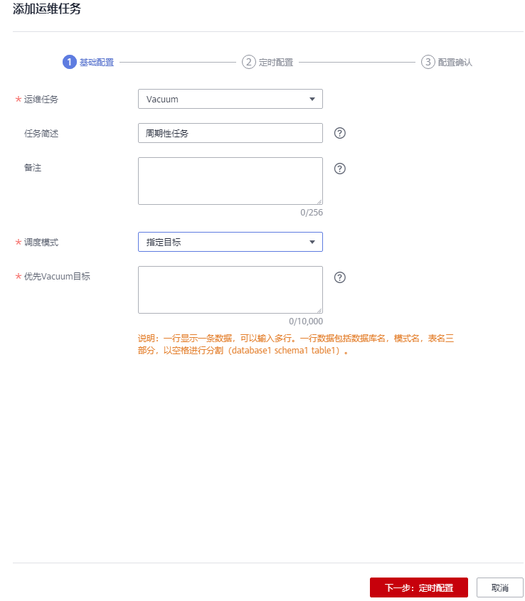 优先Vacuum目标:用户可配置优先Vacuum目标,其中一行对应一张表,每张表以数据库名、模式名、表名表示,以空格进行分割。