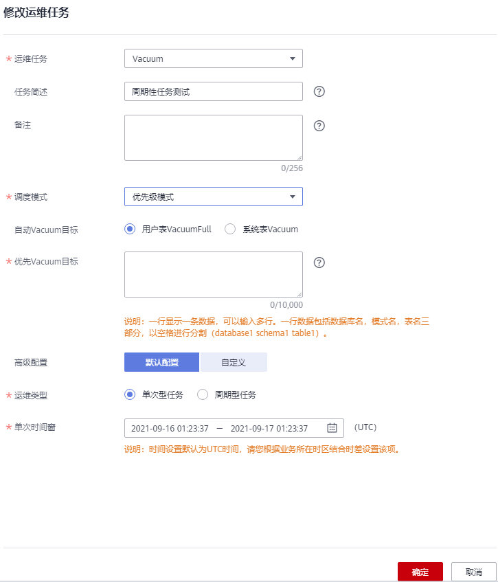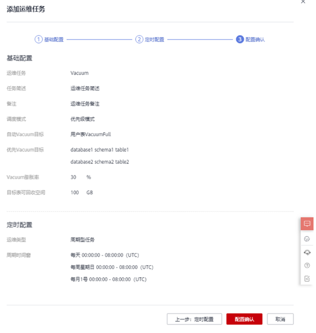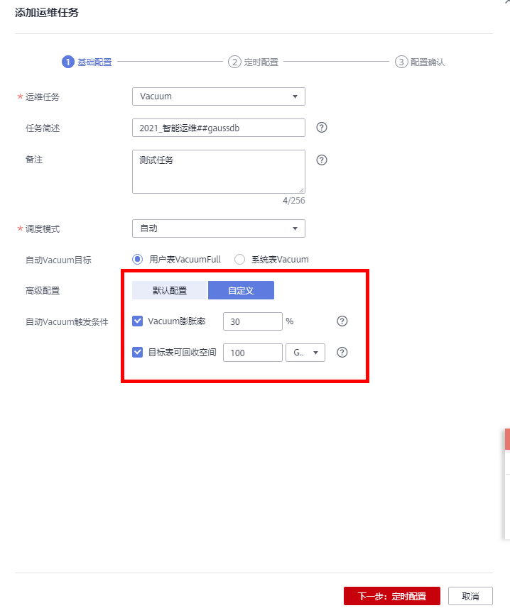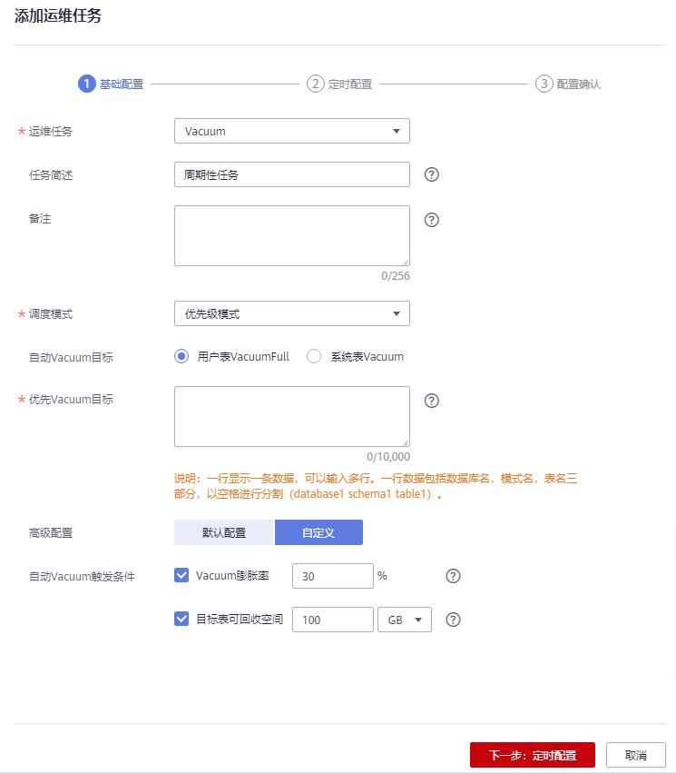 若选择“默认配置”,Vacuum膨胀率默认为30%,目标表可回收空间默认为100GB。